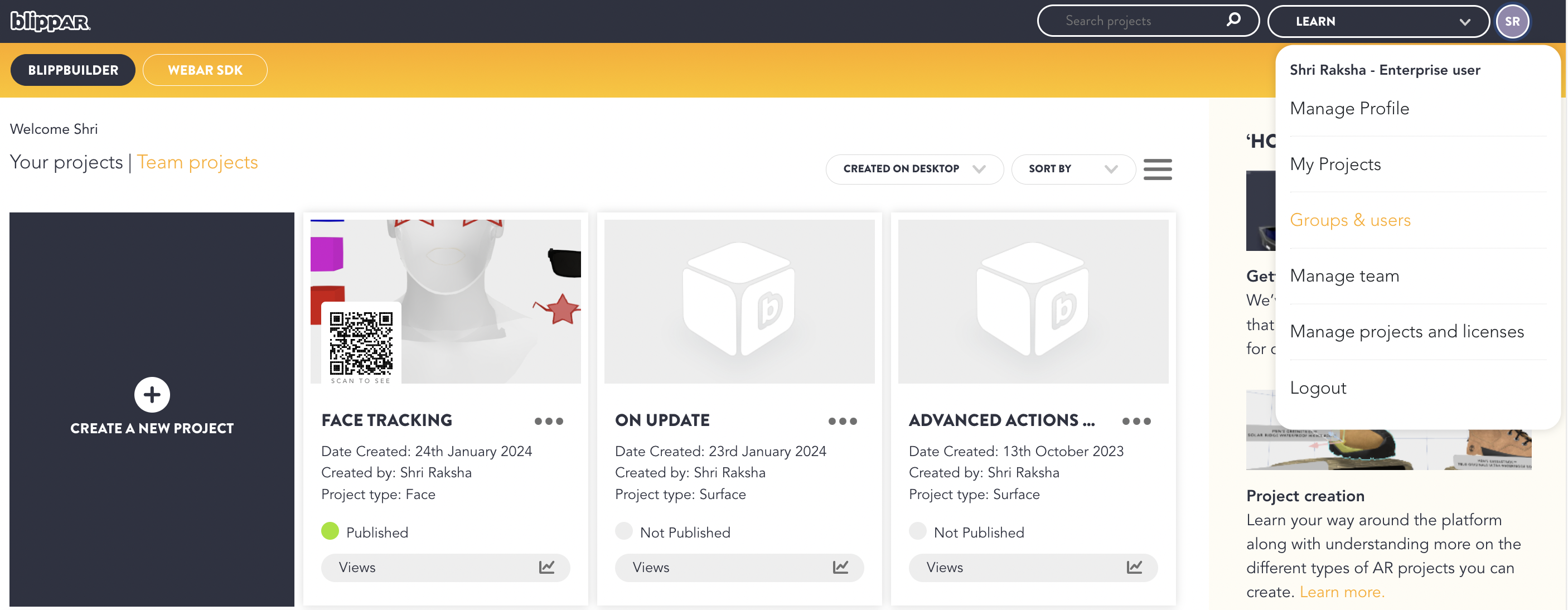 Blippbuilder allows you to add users and create groups within your organisation to enable collaboration in creating AR projects. The following are the core concepts: