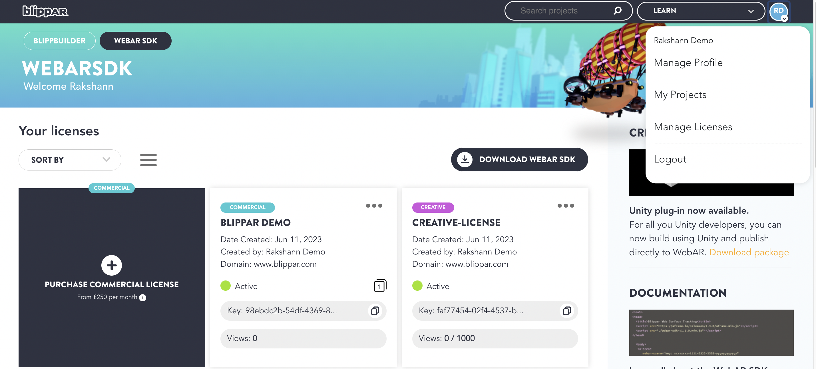 * Click the icon **'Use WebAR SDK'** to and you will be redirected to **'Your Licenses'** section