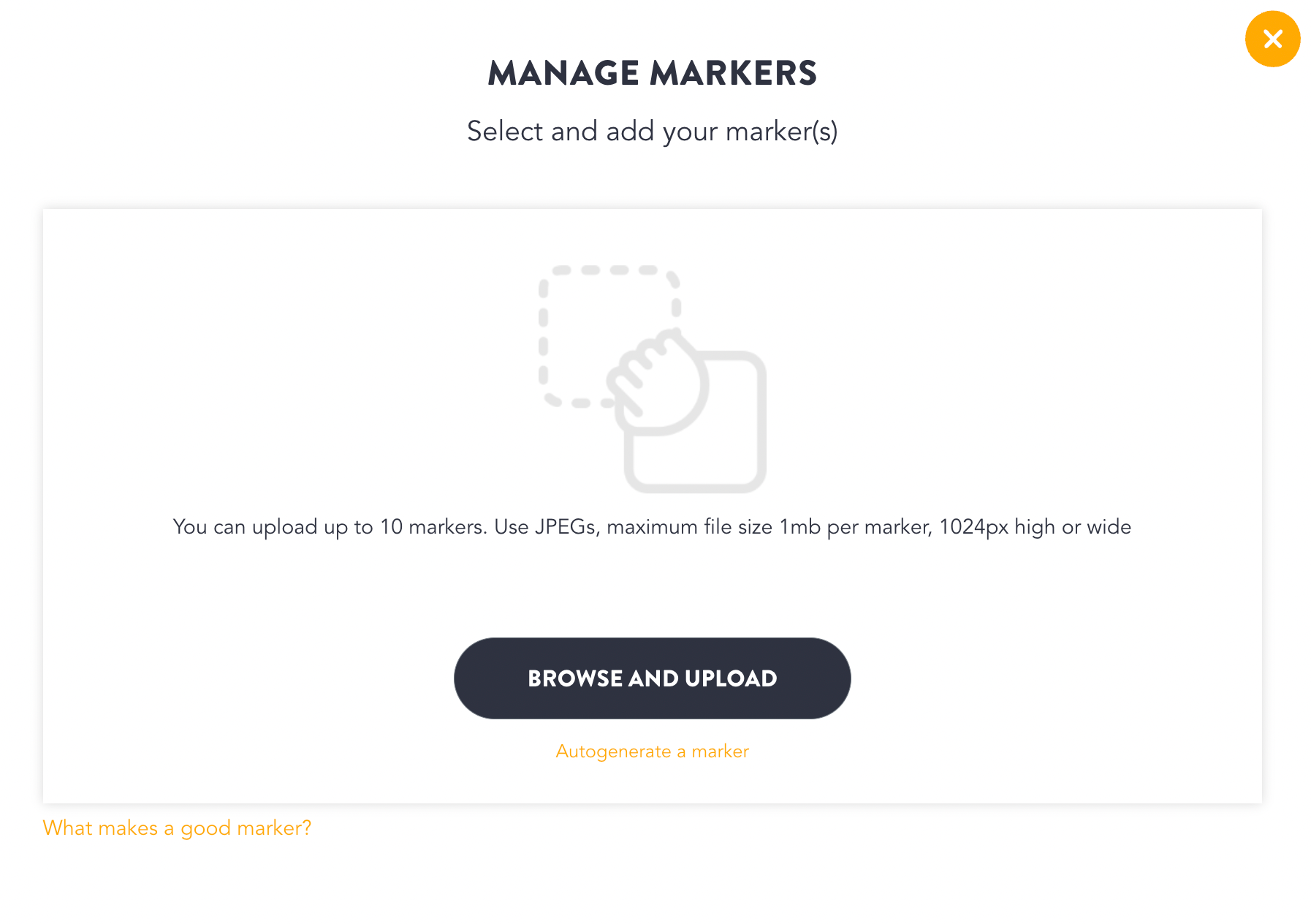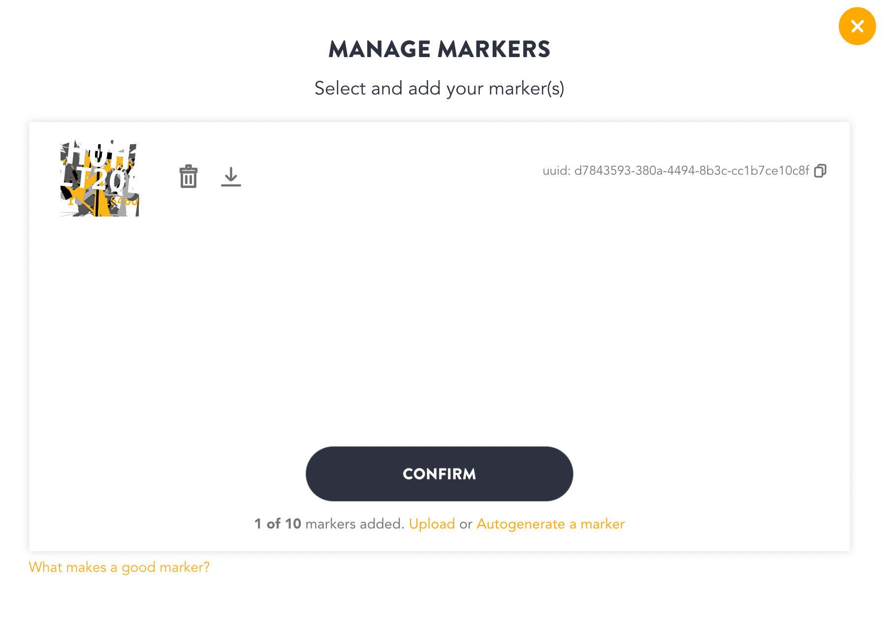 In order to create marker tracking experiences you can use the option to auto-generate a test marker or upload your own marker images.