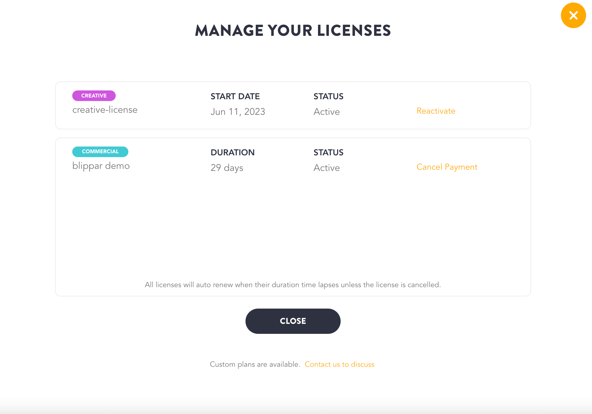 You can verify the date on which your license will expire and it will not auto renew since payment is cancelled. You can reactivate the license by clicking 'Reactivate in the same screen. Refer image below.