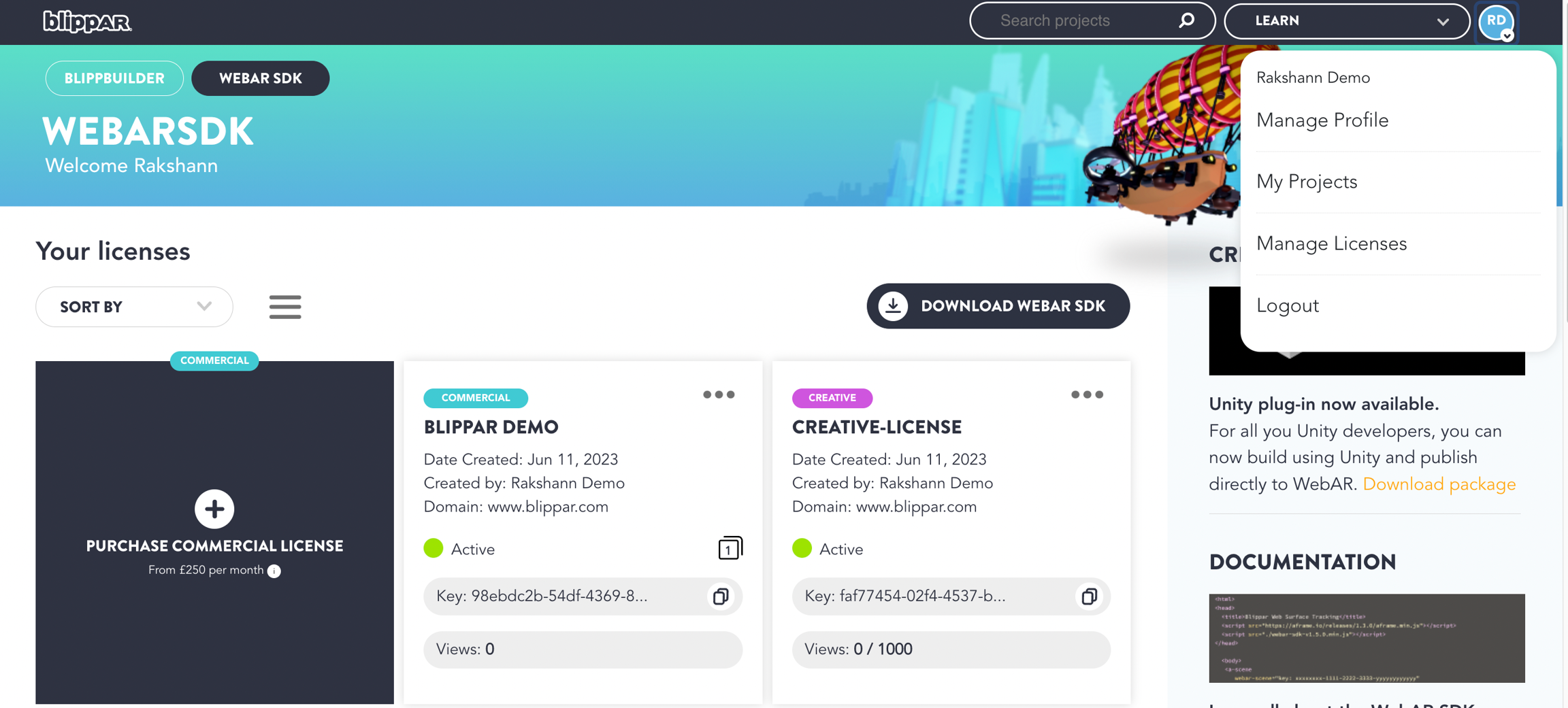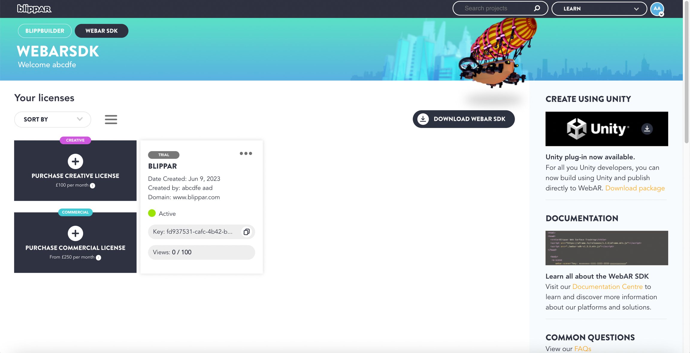 Click the icon 'Use WebAR SDK' to and you will be redirected to 'Your Licenses' section