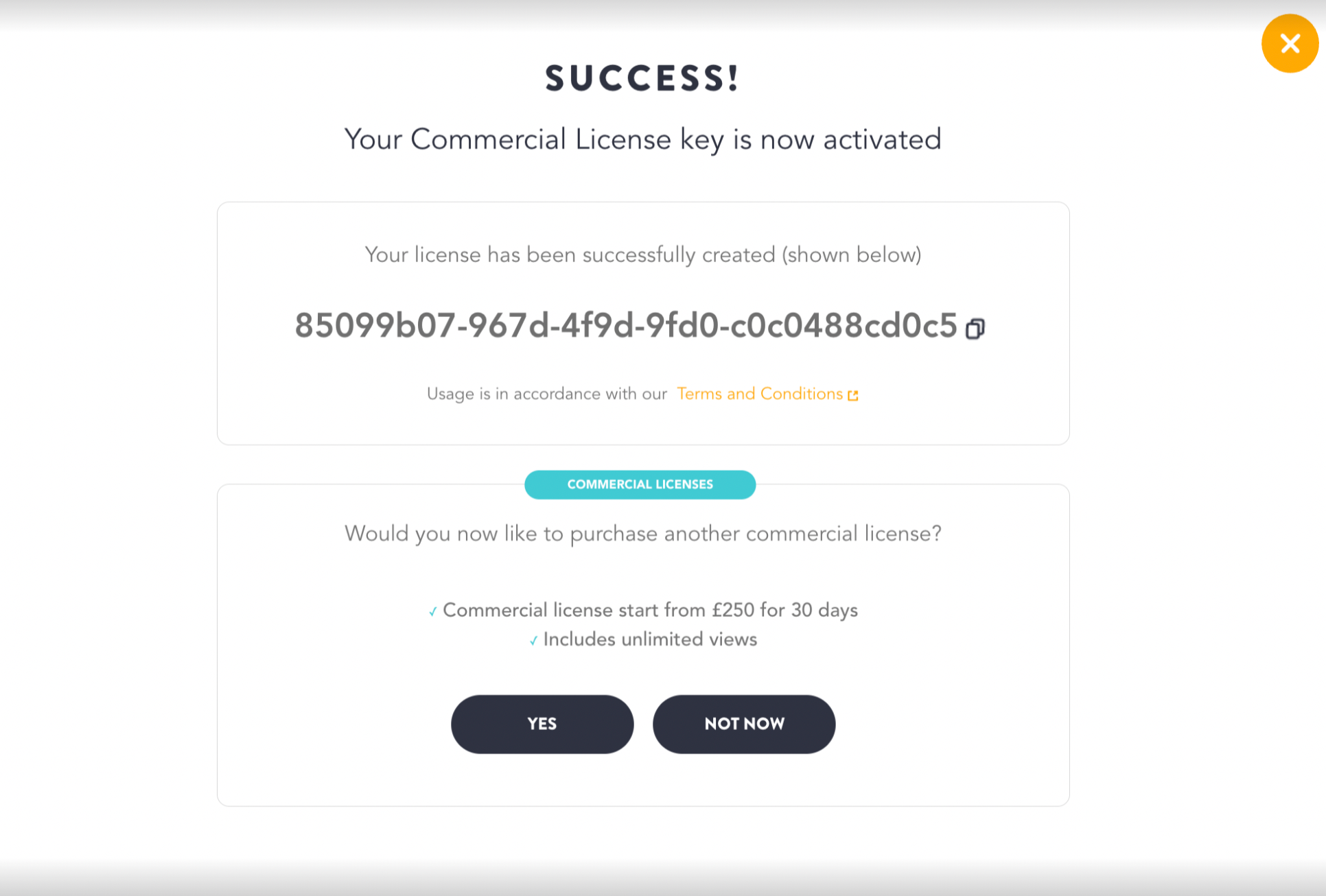You will get a pop-up confirming your license creation.