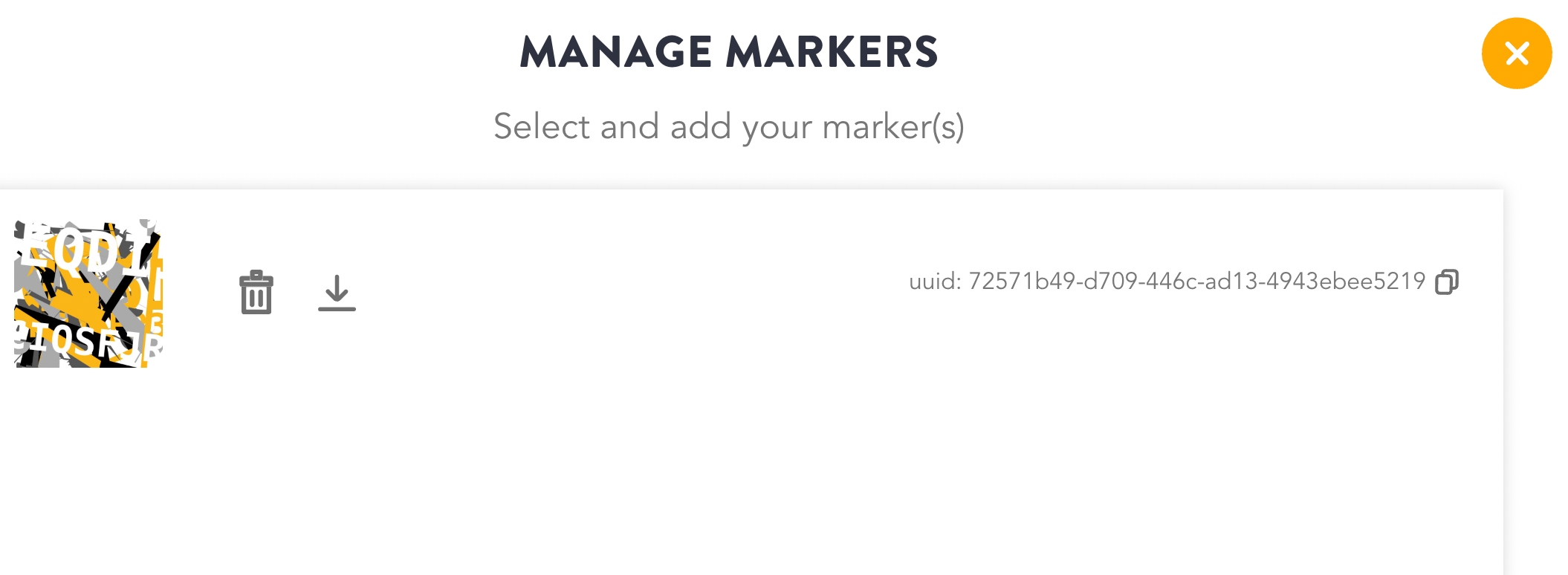 <a-entity webar-marker="id: b3ed7e4c-7423-44c0-8af1-63567b27a1e9">To add more markers IDs replicate the above steps.
