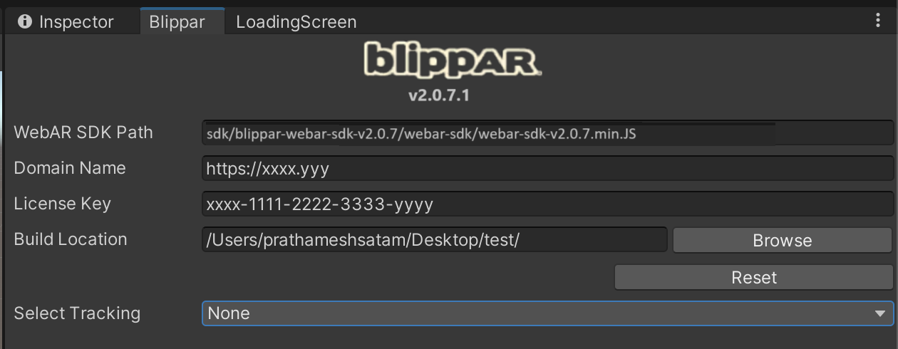 * In the Blippar Inspector tab enter the License key purchased from Blippar hub.[ See here ](https://docs.blippar.com/webar-sdk/getting-started/signup-and-get-a-license)for more details.