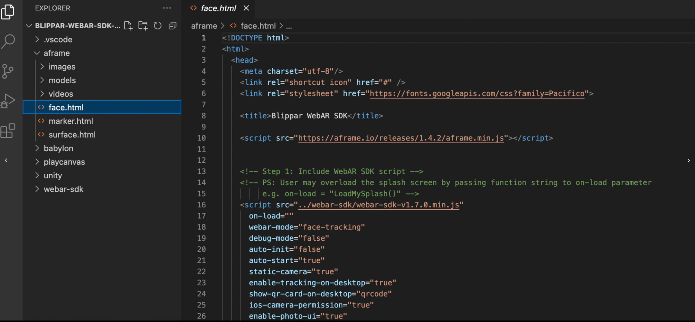 Navigate to A-frame and open the face.html file as shown below: