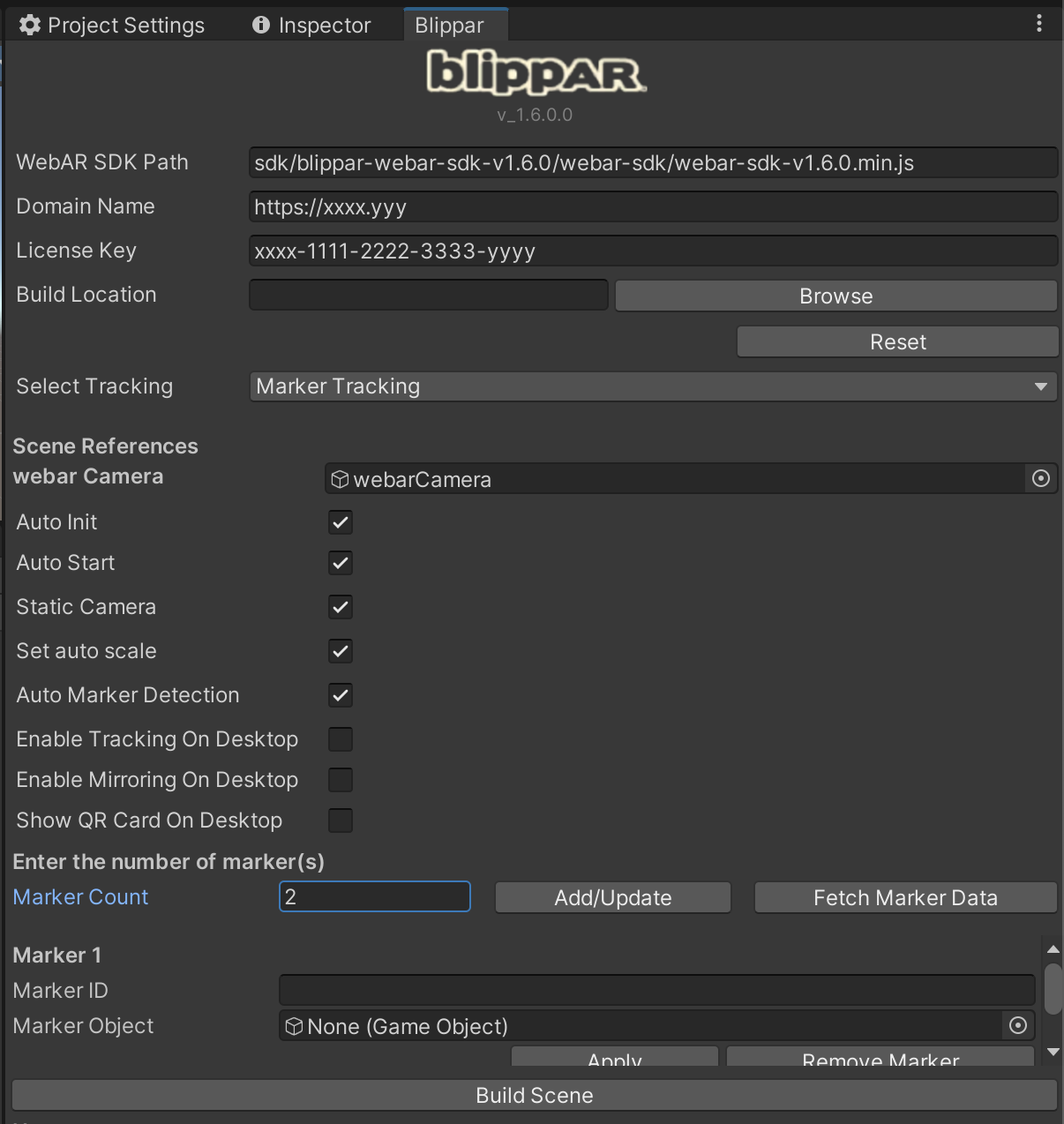 Navigate to the Blippar Inspector window and select the option ‘Marker Tracking’ as shown below: