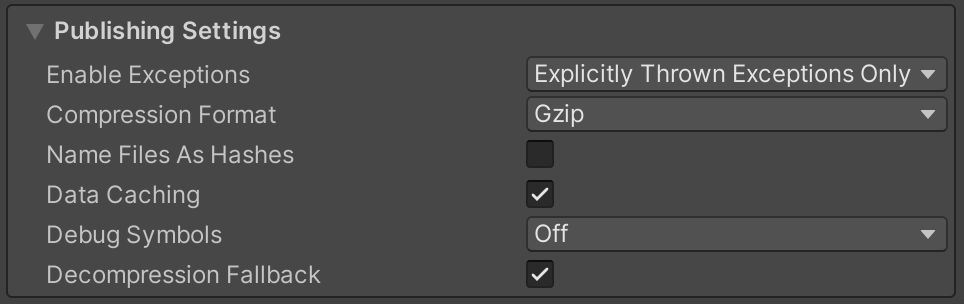 * In the Player Settings window, navigate to the "Publishing Settings" section. Publishing Settings in Unity allow you to configure various options related to building and deploying your project for different platforms. These settings determine how your game or application will be packaged, what platform-specific features will be enabled, and other deployment-related configurations. The Compression Fallback option helps ensure that your WebGL build remains accessible and playable across different browsers, even if they have varying levels of support for specific compression formats. Make sure the compression fallback is always "True"