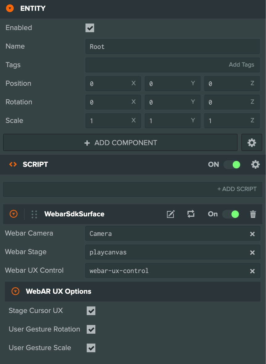 Ensure the playcanvas Entity, which needs to be displayed on a surface, is selected under the Webar Stage field.
