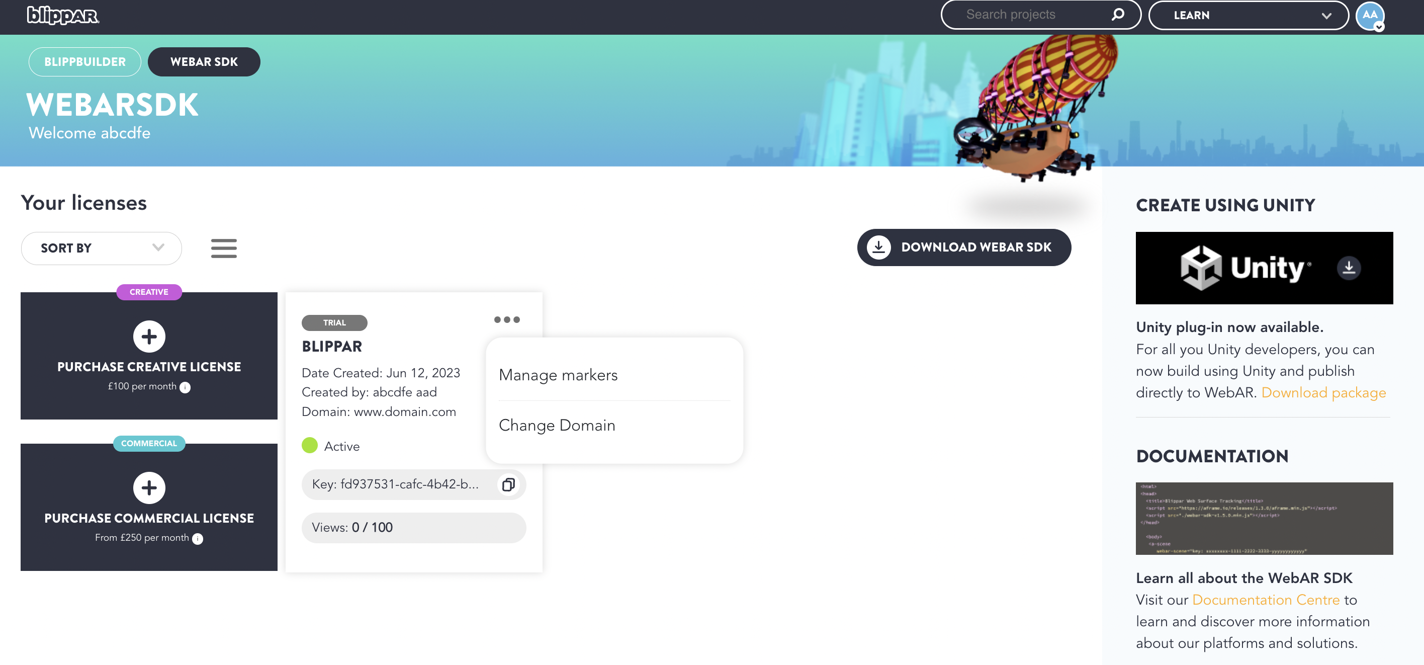 * Copy and utilize the **'Free Trial'** license key to create your AR experience using any editor. You can create unlimited surface tracking or marker tracking experiences using any of the rendering engines such as A-frame, Babylon. js, PlayCanvas or Unity. You can also test and [develop locally](https://docs.blippar.com/webar-sdk/v2.0.2/publish-your-creation/develop-locally).