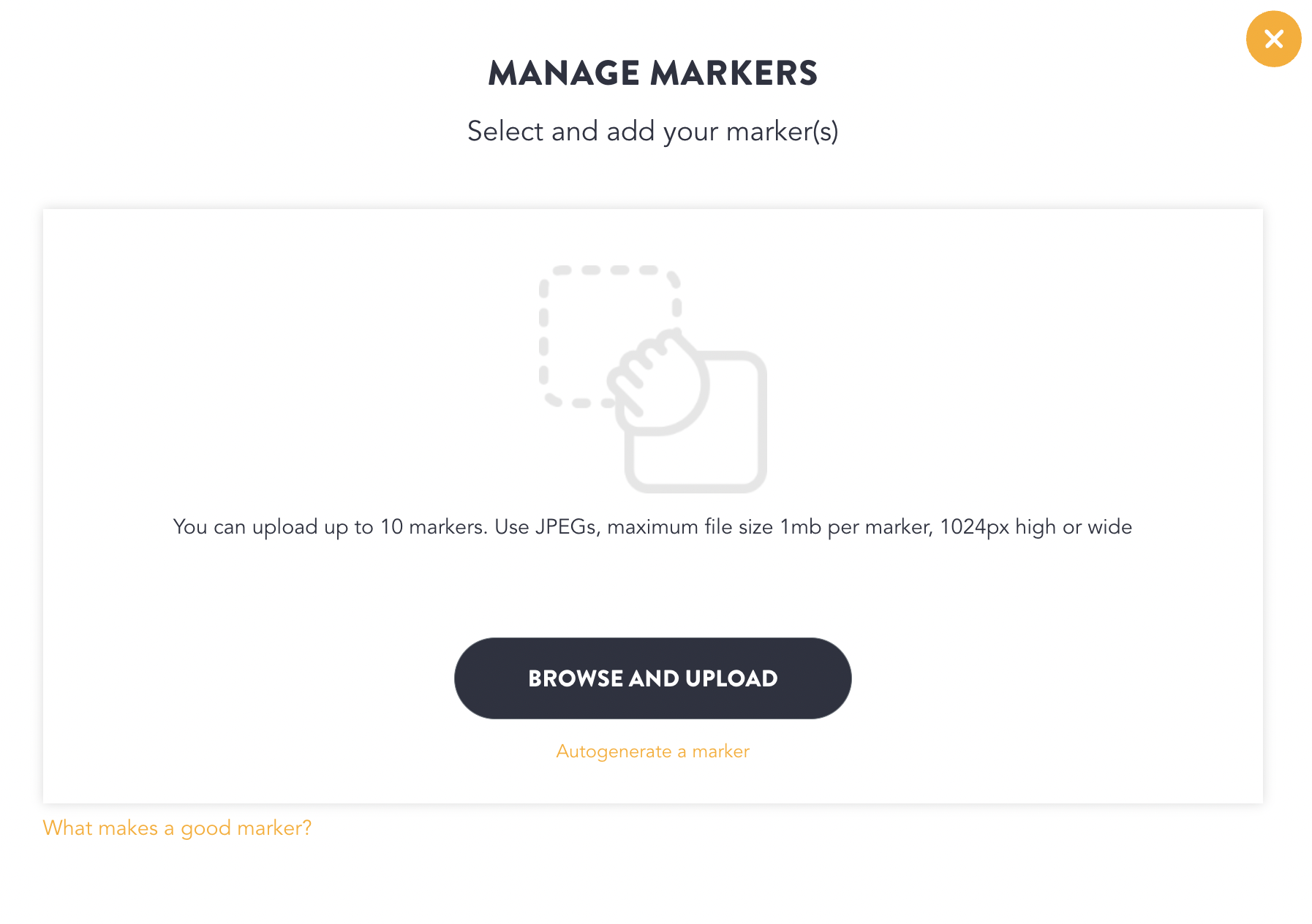 In order to create marker tracking experiences you can use the option to auto-generate a test marker or upload your own marker images.