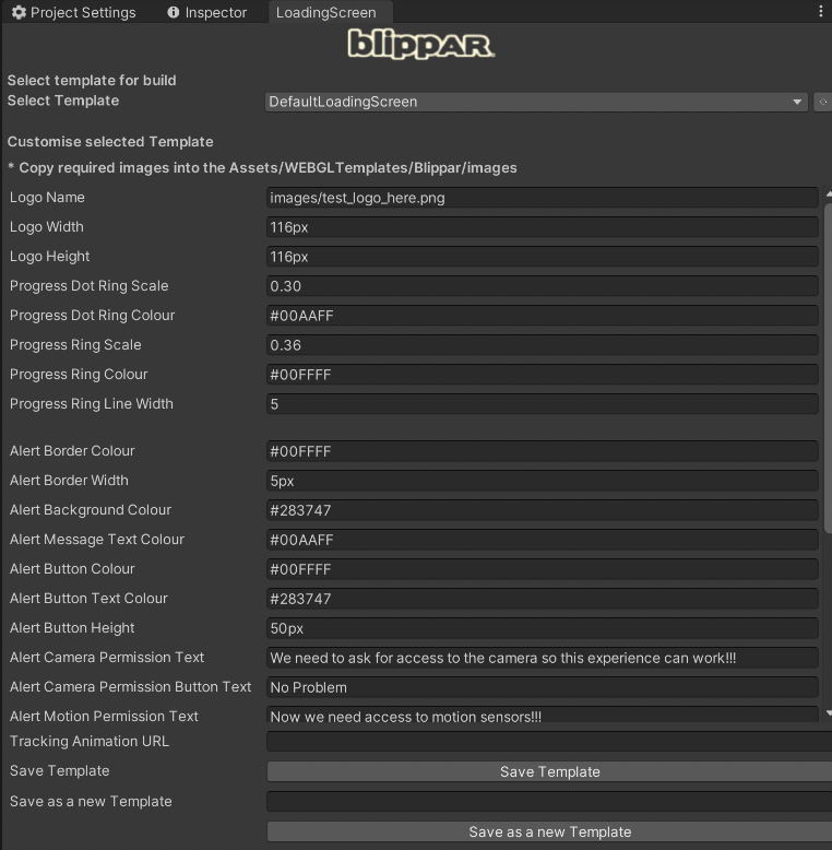 Provide the name of the logo and store the required assets into the Assets/WEBGLTemplates/Blippar/images. This is the folder location in which the image files must be stored in order to effectively trigger the customized animation.