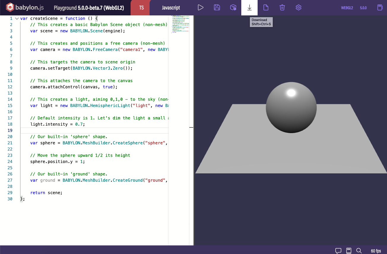Create a basic scene from playground.babylonjs.com and download the source code by clicking the Download button.