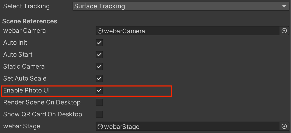 "Enable Photo UI" parameter allows you to show/hide the screenshot button state, to show the button just check the Enable Photo UI button and uncheck for hide.